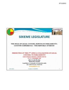 We are privileged to have been invited to participate in this august Colloquium to share our experience as legal Counsel serving in Benin’s Parliament.