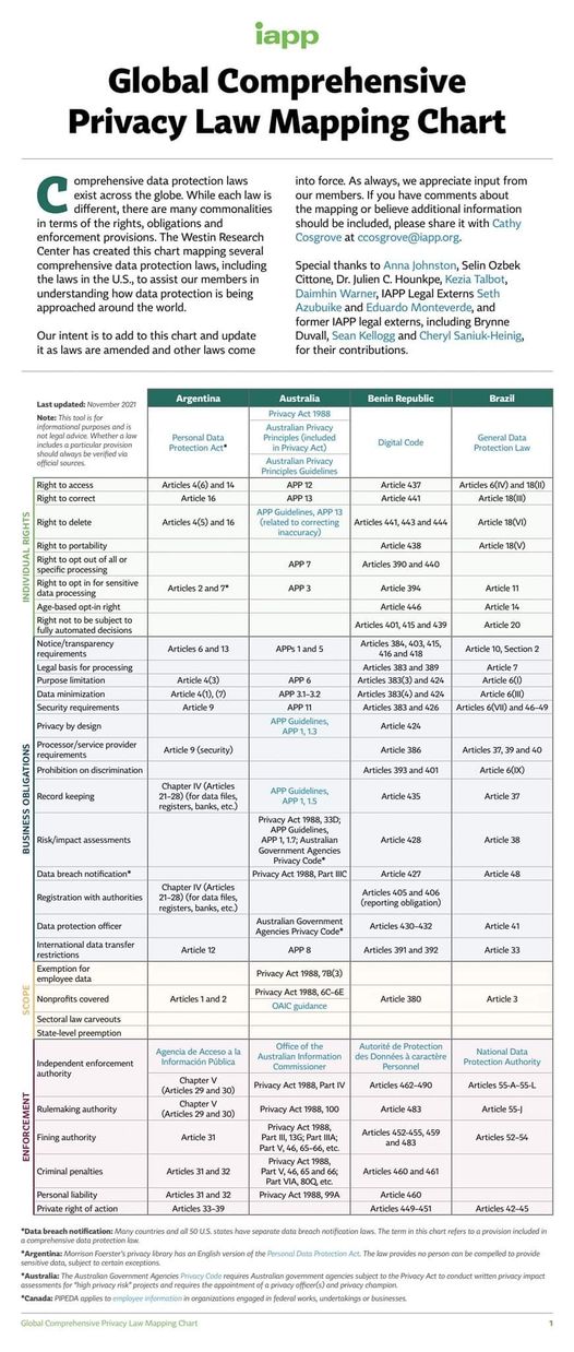 IAPP (International Association of Privacy Professionals) vient de publier un tracker des lois sur la protection des données personnelles dans le monde. Découvrez ma contribution sur le Bénin à la page 1 ci-dessous, et trouvez le tableau complet de cartographie mondiale des lois sur la protection des données personnelles ici : http://ow.ly/ntZQ50G6Dwc
